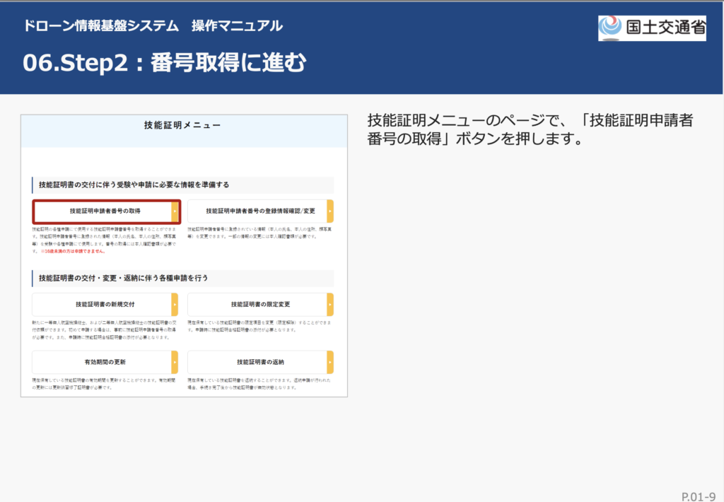 結論:DIPS2.0にログイン後、ポータル画面から「機体認証、技能証明の取得手続」へ進み、「技能証明申請者番号の取得」を選択します。
