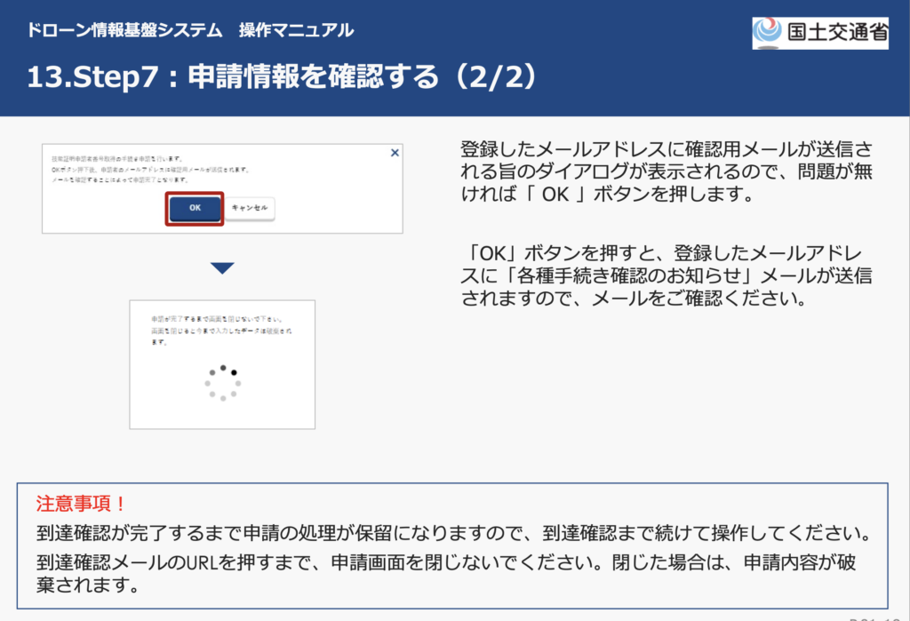 - 航空局で申請内容の確認が行われ、確認が終了するとメールで通知されます。